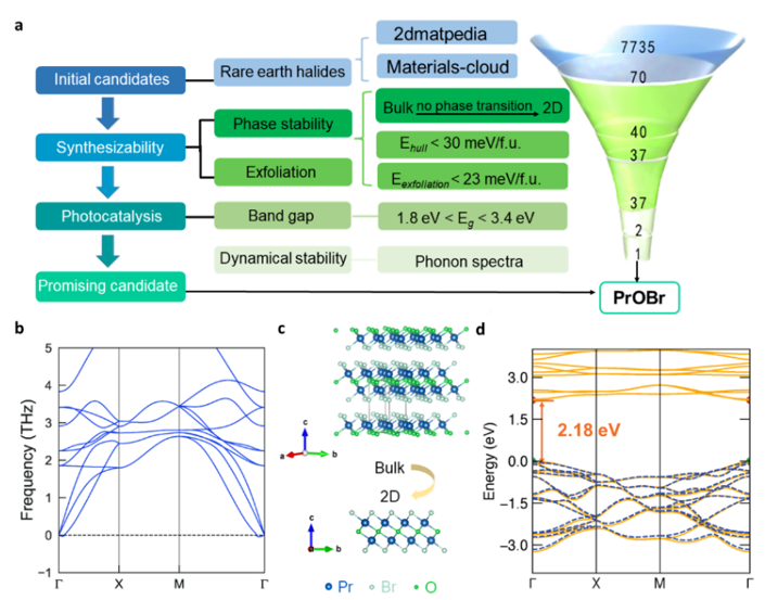 受此启发,我们围绕二维稀土材料,采用高通量方法,开展基于密度泛函理论的光催化材料筛选。通过筛选数据库中二维稀土材料的空间群,运用适用于二维材料能带结构、声子谱计算的mTASK泛函,约束材料晶体结构,计算材料剥离能、生成焓、声子谱等与实验相关的物理化学参数,成功筛选出新型二维光催化材料PrOBr。