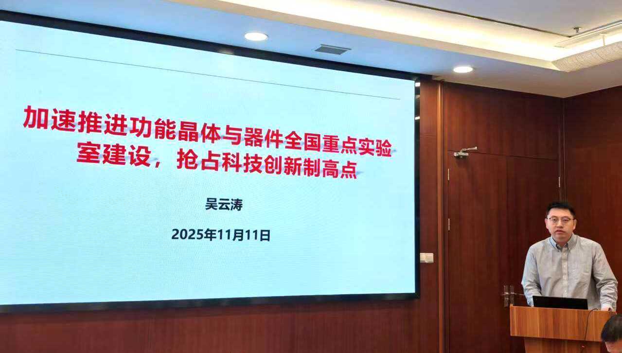 为将理论学习与研究所的核心使命紧密结合,所务委员、功能晶体与器件全国重点实验室副主任、党总支书记吴云涛作专题介绍。他以“加快推进全重实验室建设,抢占科技制高点”为主题,系统阐述了实验室的战略目标、使命任务与重点攻关方向。