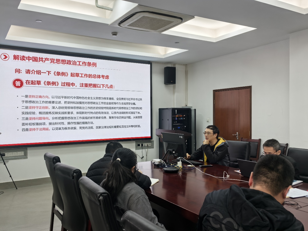 马明作《中国共产党思想政治工作条例》(以下简称《条例》)宣讲,从《条例》制定的背景意义、主要框架、主要内容及具体规定等方面进行了系统解读。支部委员会要带头学习、遵守、执行《条例》,切实履行好思想政治工作主体责任。要将思想政治工作贯穿于实验室科研、管理、人才培养等各项工作中,加强对党员和科研人员的思想引导和人文关怀,筑牢思想根基,凝聚奋进力量,营造积极向上、干事创业的良好氛围,确保党的路线方针政策在实验室得到有效贯彻落实。