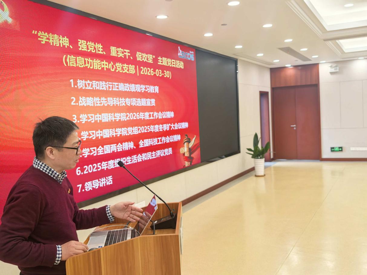 3月30日下午,中国科学院上海硅酸盐研究所信息功能材料与器件研究中心党支部开展“学精神、强党性、重实干、促攻坚”主题党日活动,深入学习贯彻习近平总书记关于树立和践行正确政绩观学习教育的重要讲话和重要指示精神、2026年全国两会精神和全国科技大会精神、中国科学院2026年度工作会议、冬季党组扩大会议精神。上海硅酸盐所党委书记王东,所务委员、科技发展部部长、发展规划处处长刘军,所务委员、信息功能中心副主任马名生,及支部全体党员和科研人员等参加活动。会议由中心党支部书记、副主任曾华荣主持。