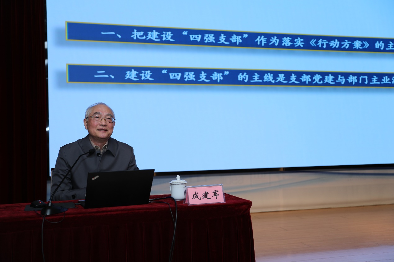 成建军作题为《贯彻院“三年行动方案” 建设“四强”党支部——关于支部党建与部门主业融合发展》的专题报告