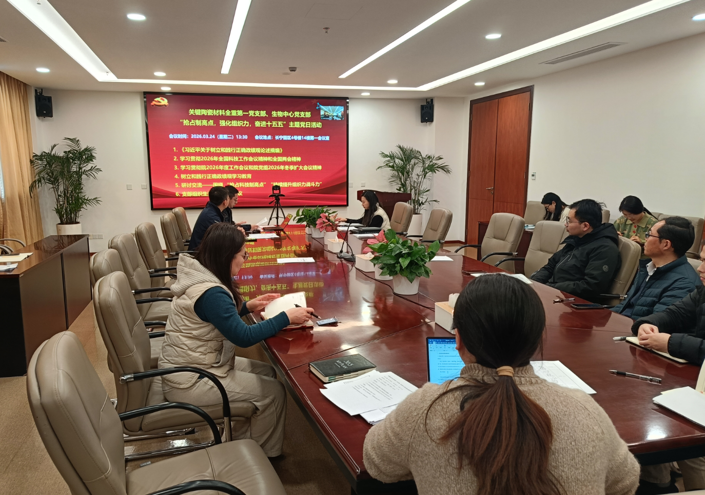 3月24日下午,中国科学院上海硅酸盐研究所关键陶瓷材料全国重点实验室第一党支部联合生物材料与组织工程研究中心党支部召开“抢占制高点,强化组织力,奋进‘十五五’”主题党日活动,上海硅酸盐所党委委员、所务委员、党委办公室主任、所办公室主任毛朝梁领学了中国科学院2026年度工作会议和院党组2026年冬季扩大会议精神。重点解读侯建国院长工作报告中重要部署,深入阐释会议对“十四五”时期全院工作的总结回顾和“十五五”开局之年的重点任务安排。强调要紧密结合关键陶瓷材料和无机生物医用材料领域国家战略需求和科研中心的发展定位,引导全体党员深刻认识作为国家战略科技力量的责任与担当。