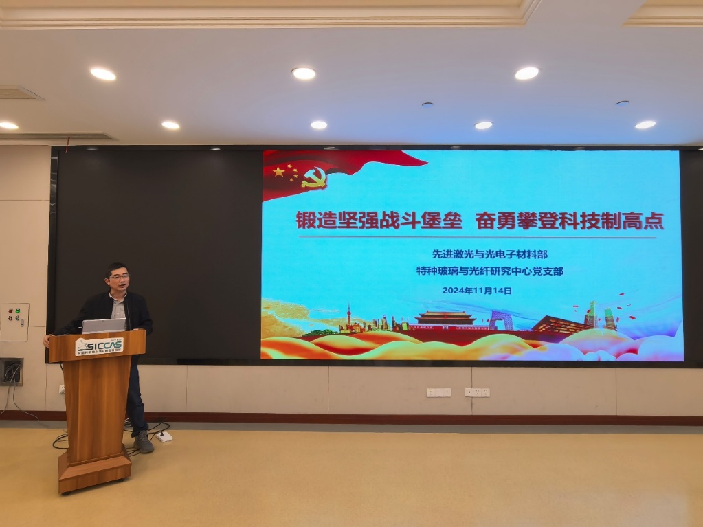 上海光机所特种玻璃与光纤研究中心党支部书记徐永春向大家作了题为“锻造坚强战斗堡垒 奋勇攀登科技制高点”的报告。介绍了上海光机所特种玻璃与光纤研究中心在高功率激光与特种玻璃、高功率激光与特种光纤、高放废液玻璃固化和高纯石英四个方面的研究内容与目标,以及党支部围绕主责主业开展的党建活动。上海光机所青年委员贺冬钰围绕上海光机所材料部在承担国家重大任务中作出的各项贡献和取得的优异成果,向大家介绍了材料部的主要研究方向以及“十五五”规划。