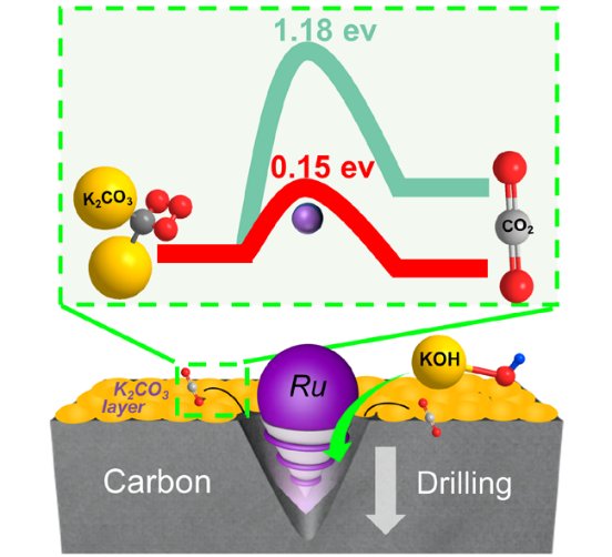 “金属纳米钻”示意图           钌局部嵌入碳复合材料的光谱及电荷转移示意图
