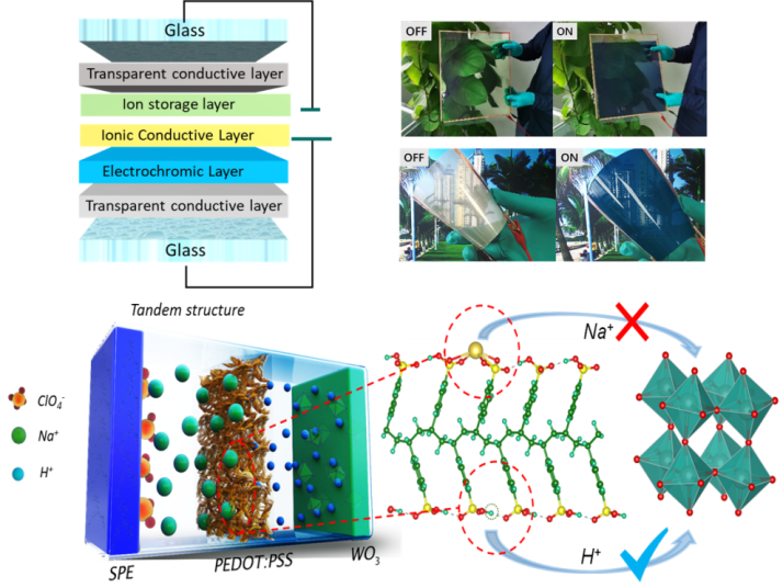 高效无机电致变色设计与离子传输机制:电致变色智能窗作为新兴技术,可通过动态独立调控近红外与可见光透射率显著降低建筑能耗。基于无机电致变色材料(阴极)、阳离子存储层、对电极(阳极)及透明电极的设计,设计泵浦式氢离子电解质层,开发出超快响应(0.7 s)电致变色器件(Nature Electronics 5, 45-52, 2022)。此外,还研究了兼具高效能的多功能EC器件,如能量存储、双稳态等特性。