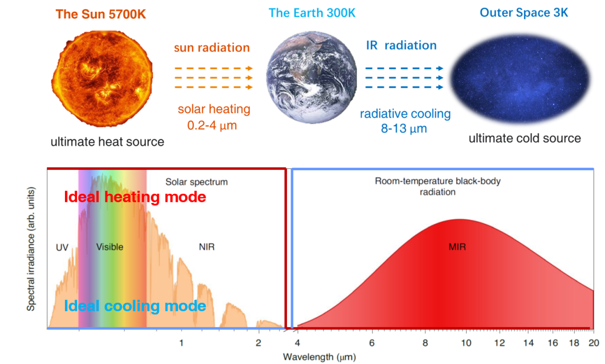 太阳(约5700 K)与外层空间(约3 K)是人类可利用的两种天然能源。然而,当前多数太阳能采集与向外层空间散热的技术方案,均采用具有静态光谱特性的吸收体与发射体独立实现。因此,开发兼具强太阳吸收能力与大气窗口(即8-13 μm)可调辐射率的自适应结构/装置,可有效实现昼间太阳能热利用与夜间辐射冷却。此外,日间辐射冷却与太阳能供暖对建筑节能具有重要意义。