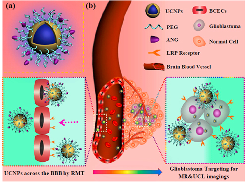 在脑中枢神经系统疾病中,脑胶质瘤是最为恶性的颅内肿瘤,然而由于血脑屏障的存在,脑胶质瘤等脑部重大疾病的早期诊断和有效治疗均不理想。针对目前影像探针存在着跨越血脑屏障侵害性、效率低、靶向性差以及脑胶质瘤成像诊断模式单一等缺点,依据该研究团队关于“正负晶格屏蔽效应”的设计思路(Adv. Funct. Mater. 2011, 21, 4285-4294),他们采用晶格外延生长技术,制备了高性能上转换发光(UCL)/ 磁共振成像(T1-MRI)双模式影像探针(NaYF4:Yb/Tm/Gd@NaGdF4):核壳结构设计不但显著提高了上转换发光性能,同时又高效引入了磁共振(T1-MRI)造影功能,实现了UCL/T1-MRI双模式成像。进一步在探针表面嫁接具有双靶向功能的多肽(Angiopep-2),则赋予探针双靶向功能:即不仅可以靶向脑微血管内皮细胞,通过受体介导方式高效跨越血脑屏障,同时可以靶向脑胶质瘤(U87MG),定位肿瘤边界,为部分解决“脑胶质瘤术前T1-MRI诊断及术中荧光介导切除”医学难题提供了新的思路,具有潜在的重要医学临床应用前景。相关研究成果已发表于:ACS Nano, 2014, 8 (2), 1231–1242。该工作在线发表后受到相关国际媒体的关注,其中ChemPubSoc Europe (欧洲化学出版协会)旗下的著名专业新闻媒体“ChemistryViews”以Bimodal Nanoprobes to Image Brain Tumors 为题对该工作进行了专题报道。