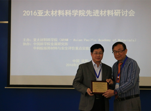 5月21日至23日,2016年亚太材料科学院(Asia Pacific Academy of Materials,APAM)先进材料研讨会在中国科学院沈阳金属研究所召开,会议为2015年新当选的中国大陆8位亚太材料科学院院士(APAM Academician)颁发了证书,中国科学院上海硅酸盐研究所陈立东研究员、温兆银研究员入选。