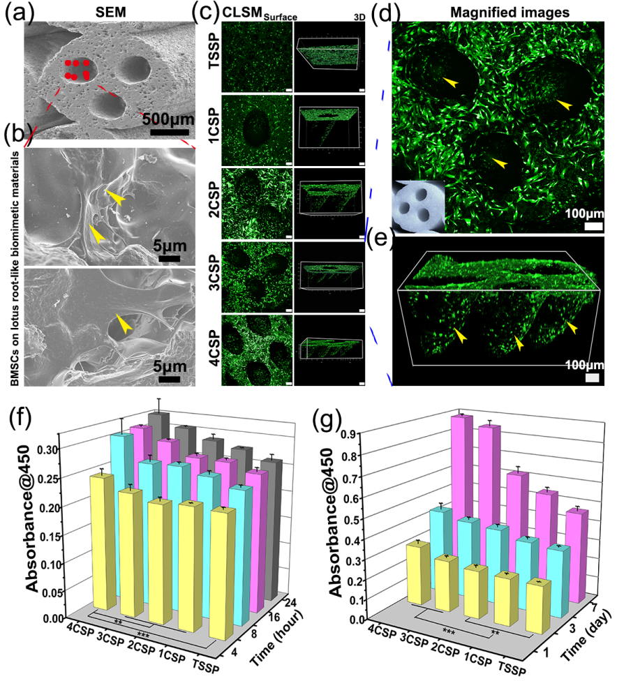 仿生莲藕支架的体内生物学分析。(a)兔子间充质干细胞(BMSCs)在仿生莲藕支架上的SEM照片,(c-e)细胞培养在支架上第3天的共聚焦显微镜照片,仿生莲藕支架的(f)细胞粘附和(g)增殖结果。