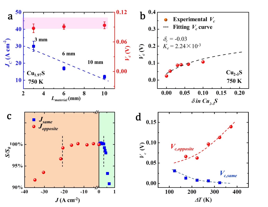 为了从实验上证明类液态热电材料热力学稳定极限的存在,该团队自主搭建了定量表征类液态热电材料服役稳定性的仪器。在恒温环境和给定温差环境下,分别利用相对电阻和相对塞贝克系数的变化作为评价参量,成功测量了一系列Cu2-δ(S,Se)类液态热电材料的临界电压,其数值范围为0.02-0.12V。在恒温环境下,随Cu缺失量δ增加或所处环境温度增加,Cu2-δ(S,Se)材料的临界电压逐渐增加,其数值与理论预测相吻合,表明材料中具有“类液态”特征的金属阳离子更难于析出。在给定温差环境下,Cu2-δ(S,Se)材料的临界电压还与材料内部热流方向有关。当热流方向与电流方向相同时,材料具有更小的临界电压,表明材料中的金属阳离子更容易析出。反之,当热流方向与电流方向相反时,材料具有增强的临界电压,材料稳定性显著增加。