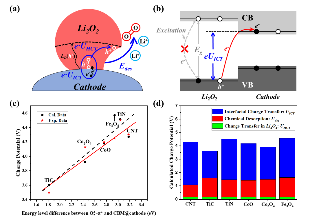 (a) Li2O2分解过程,包括化学脱附(e·Udes)和在Li2O2内部的电荷传输(e·UHCT)以及在Li2O2@正极界面的电荷转移(e·UICT);(b)能带排列(Li2O2中O22--π*能级与正极导带底能级的匹配关系)策略示意图;(c)充电电位计算值和实验值对比图;(d)化学脱附过程、电荷转移过程对充电电位的贡献占比。