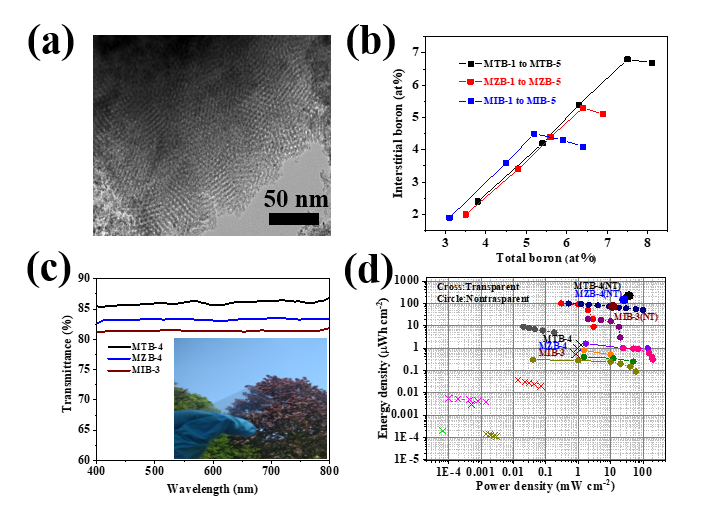 间隙硼掺杂介孔半导体氧化物的形貌(a, MTB),掺杂浓度调控(b)以及透明电极性能(c,d)。MTB: 介孔SnO2-xBy; MZB: 介孔ZnO1-xBy; MIB: 介孔In2O3-xBy