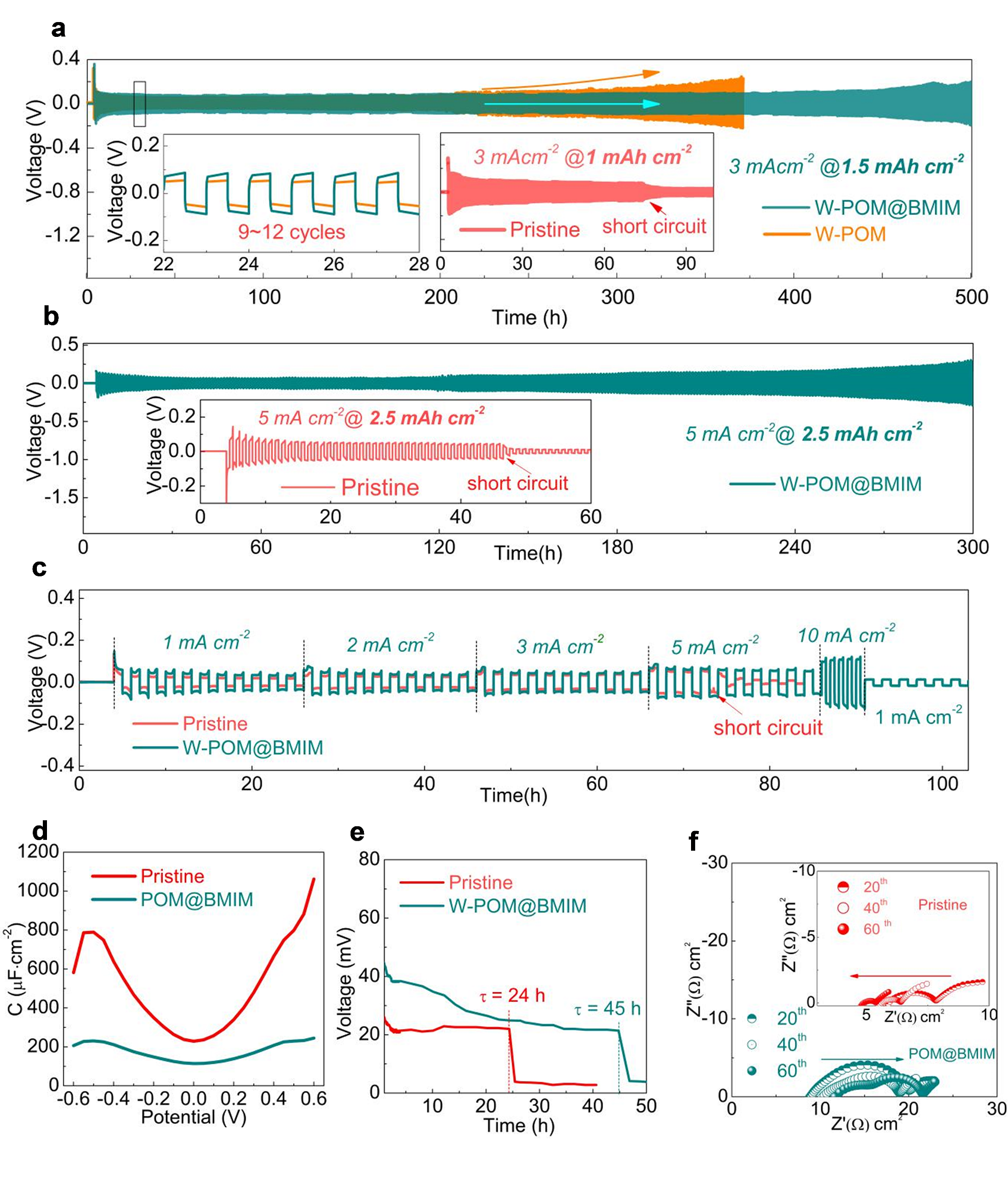 在锂离子电镀过程中,表面带正电荷的添加剂容易吸附在突起的电子集中分布的尖端上,靠近这些区域的锂离子受到一定程度的排斥,从而使锂离子在负极上的流动分布趋于均匀化。逐渐释放的具有非定域负电荷和丰富O官能团的无机POM核将收集从尖端排斥至周围的锂离子或在电解液中溶剂化的锂离子。在重复充放电过程中的电场力作用下,POM聚阴离子和反电荷离子之间的动态可逆和非锚定的静电相互作用使POM的释放具有可持续性。在捕获电子后,这些POM核将和被吸收的锂离子共组装,类似特殊的成核调节器,因此,Li离子流和Li金属沉积被进一步引导和均化。这一斥锂-富集协同机制促进了LiF和LiNxOy组分在负极界面层(SEI)的富集,有利于对锂枝晶的抑制作用。