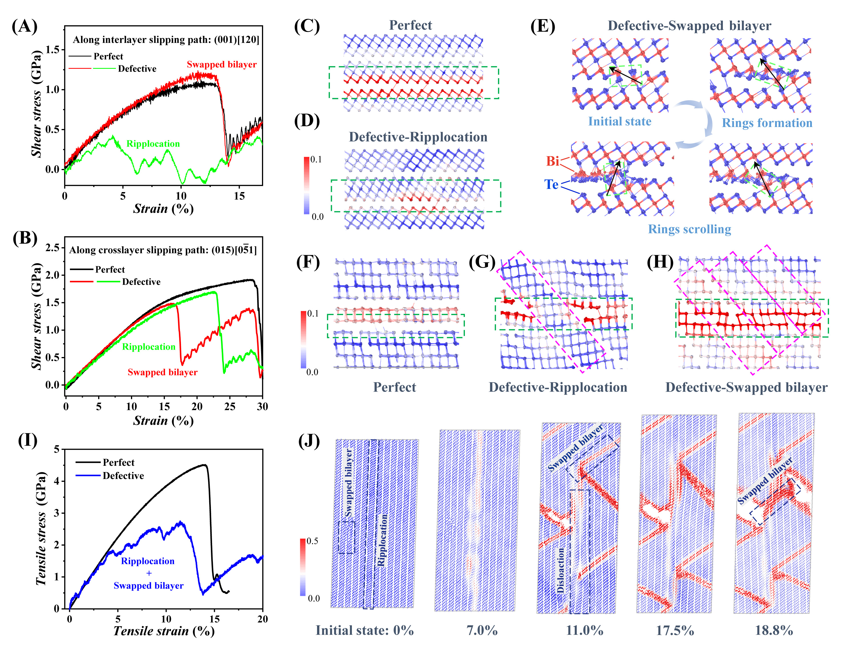 以交错层和涟漪两种微结构为例,利用分子动力学计算揭示了其对力学性能的影响。在缺陷Bi2Te3单晶中,范德华层间存在Bi-Te化学键,且原子剪切应变分布不均匀,表明剪切过程中存在原子的局部位移。层间Bi-Te化学键可以作为桥梁连接近邻的范德华层以强化层间相互作用和抑制层间解理。同时,交错层中的原子形成了Te-Bi-Te-Bi四元环,在剪切过程中可像轮子一样连续滚动以促进层间滑移。拉伸模拟过程中的应力分析表明跨层剪切主要发生在交错层和涟漪两种微结构附近。在交错层附近存在微裂纹,但是其扩展受到了涟漪的阻碍。上述结果证明了高密度/多样化的微观结构是Bi2Te3单晶发生塑化的重要原因。