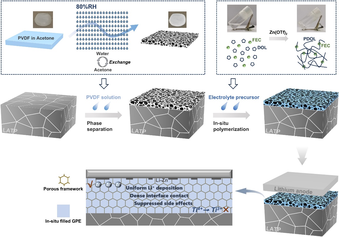 针对上述问题,中国科学院上海硅酸盐研究所能源材料研究中心张涛研究员团队提出了一种湿度诱导的多孔隔离框架内填原位固化凝胶电解质界面层来稳定LATP与锂负极界面,由于多孔框架有效隔绝了LATP与锂负极的物理接触,热力学自发副反应被显著抑制,凝胶电解质由于对锂负极具有良好的稳定性,枝晶延伸导致的动力学还原副反应被进一步抑制,引发剂被锂负极还原形成Li-Zn合金促进了锂的快速均匀传输和沉积,进一步减小了由锂不均匀沉积导致的还原副反应,最终LATP和锂负极界面稳定性得到了显著的提升。该成果以“A Facile Humidity-Induced Porous Framework Filled with In Situ Initiated Gel Electrolyte for Stabilizing Li1.3Al0.3Ti1.7(PO4)3/Li Interface”为题,于近日发表在Advanced Functional Materials (DOI: 10.1002/adfm.202420202)上,论文第一作者为上海硅酸盐所2022级博士研究生杨德志,通讯作者为张涛研究员。