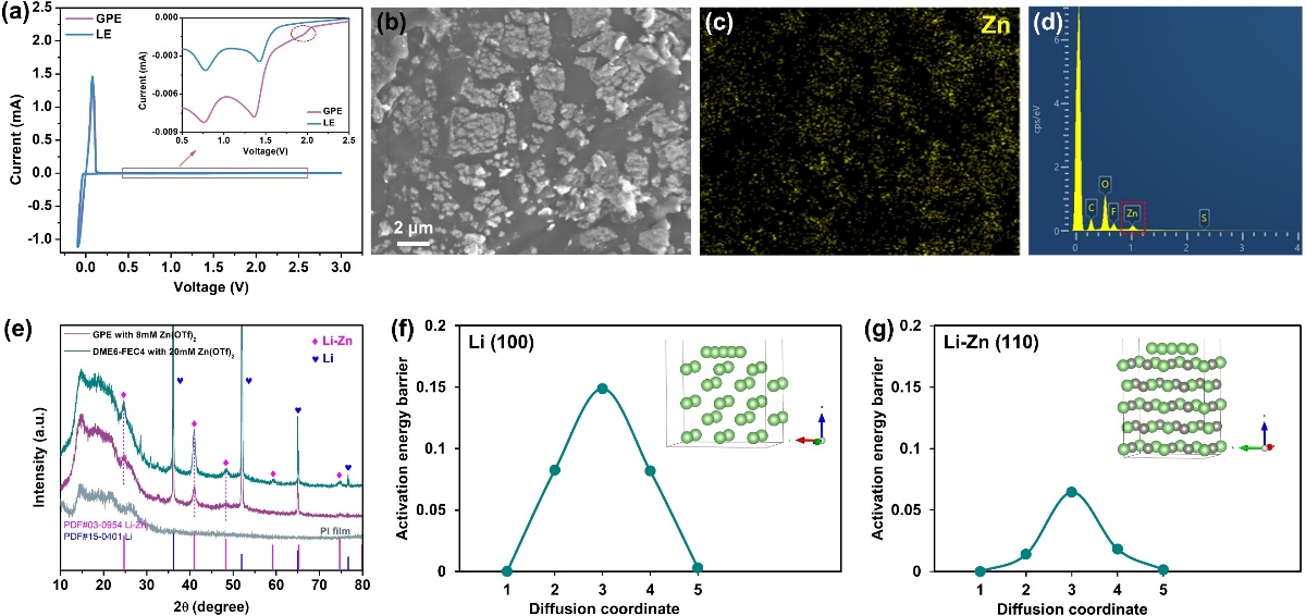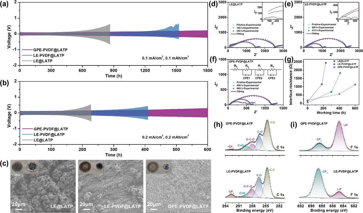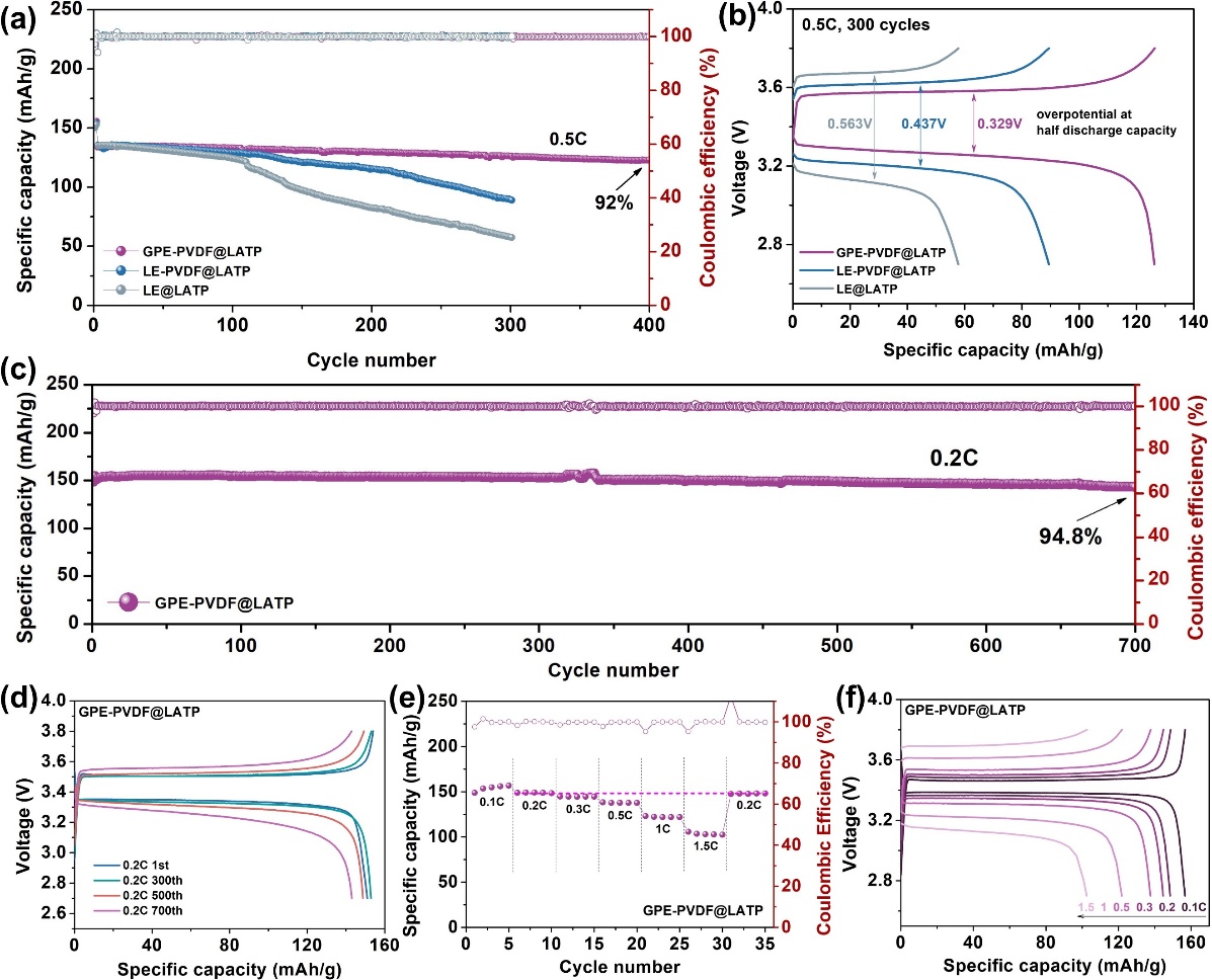 该工作首先采用一种简单的湿度诱导非溶剂相分离法,在LATP片体表面制备了一层5μm的PVDF多孔框架,该框架能有效地隔绝LATP与锂负极的物理接触,这可以很大程度上抑制热力学上自发的还原副反应;内部填充的1, 3-二氧五环单体经Zn(OTf)2引发开环形成聚1, 3-二氧五环,并在氟代碳酸乙烯酯的塑化作用下形成凝胶电解质,聚合后的凝胶电解质有效地提升了锂负极的稳定性,抑制了枝晶的生长,间接的抑制了枝晶穿透导致的动力学还原副反应;Zn(OTf)2在锂负极被还原形成了Li-Zn合金,有效地降低了锂离子在负极的扩散能垒,促进了锂离子的快速均匀沉积,这进一步减少了由锂沉积不均匀延伸导致的动力学还原副反应。上述多效应的协同作用有效地提升了LATP与锂负极界面的稳定性,搭配上述复合界面层的LATP基锂对称电池在0.1mA/cm2下能稳定循环1800h以上,将该界面层应用于磷酸铁锂为正极的LATP基固态锂电池,在室温0.5C下循环400圈容量保持率为92%,在室温0.2C下循环700圈容量保持率为94.8%,与领域内同类型的界面修饰工作相比,该结果显示出了显著的优势和先进性。