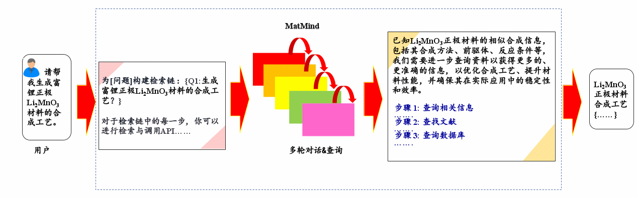 MatMind引入了思维链(CoT)与检索增强生成(RAG)机制,二者协同工作以提升推理的精准性和可靠性。CoT通过将复杂任务分解为多个推理步骤,确保逻辑清晰、推理透明,减少“幻觉”现象,并提高答案的准确性与可追溯性。RAG机制结合外部知识库进行信息检索,通过快速查找相关知识片段并整合生成答案,确保基于最新、最相关的知识资源,从而解决传统生成模型中的“知识封闭”问题,提升处理动态信息的灵活性与精准性。CoT与RAG的结合,使得MatMind能够在多轮推理过程中动态地召回信息并根据需要进行知识更新,从而捕捉不同领域之间的隐性关联。通过这种协同工作,MatMind生成的答案不仅更加精准和连贯,还能更好地适应材料科学等复杂领域中的实际应用需求。