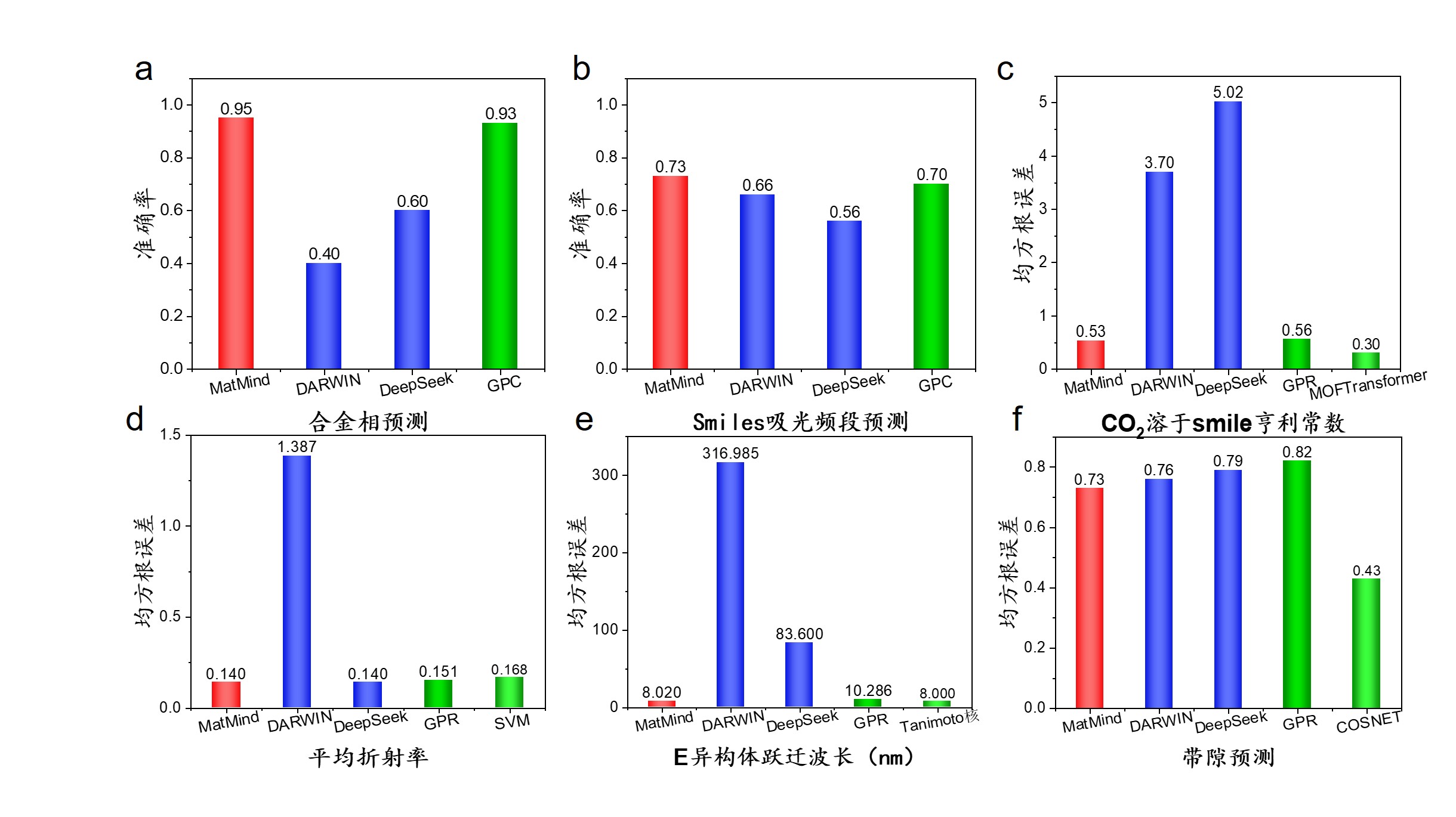 在数值属性预测中,MatMind的表现尤为突出。对于CO₂溶于SMILES亨利常数预测,MatMind的均方根误差(RMSE)为0.53,显著优于DARWIN(3.70)和DeepSeek(5.02)。在平均折射率预测中,MatMind的RMSE为0.140,优于GPR(0.151)和SVM(0.168)。在E异构体跃迁波长预测中,MatMind的RMSE为8.020,远超其他模型(DARWIN 316.985、DeepSeek 83.60、GPR 10.286)。在带隙预测中,MatMind的RMSE为0.73,与其他模型接近,但仍优于GPR(0.82)。