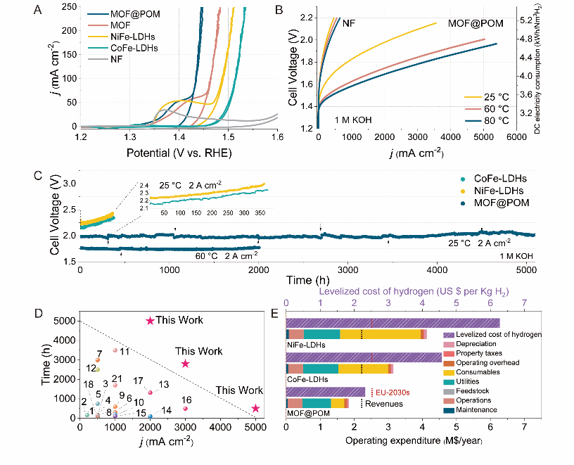 MOF@POM的活性和实际运行中的稳定性(A-C)。该工作和其他已报道的碱性阴离子膜电解水电解槽的参数对比以及经济效应分析(D-E)。