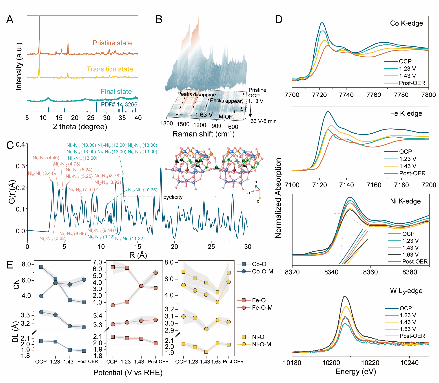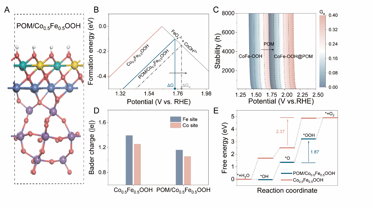 针对上述问题,研究团队创新性的提出了多酸接枝固定水氧化活性位点设计方法,首次制备出了高效多酸接枝的单层钴铁氢氧化物超结构水氧化催化剂。该方法首先通过定向接枝方法,将二维钴铁金属有机骨架(CoFe-MOF)与多金属氧酸盐(Ni-POM)组装,获得多酸接枝的金属有机骨架(MOF@POM)超结构。在电催化水氧化过程中,该超结构中CoFe-MOF原位转化重构为单层钴铁氢氧化物(CoFe-LDH),并通过Ni-O桥以共价键与POM连接。研究人员进一步揭示了包括钴、铁活性位点和镍、钨调控位点在内的多位点协同、功能集成的稳定性设计新原理。原位电化学谱学研究发现,该结构中钴和铁位点作为活性中心其价态不断升高,而镍氧桥和钨氧骨架作为配位调节基元其价态规律振荡,多酸出色的氧化还原特性有效解决了现有水氧化金属活性位点氧化还原不可逆调控难题。实验结合理论进一步证实Ni-O桥通过晶格应变释放稳定Co/Fe催化活性位点,多酸中金属W价态振荡(W5+/6+)动态调控电子密度;同时多酸基元协同降低氧活化能垒,形成应力-电子双层维度稳定机制,从而突破了传统催化剂的性能瓶颈。