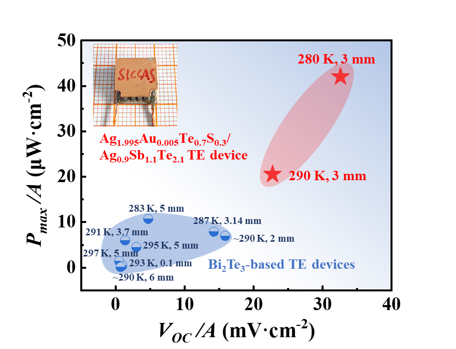 图2. 本工作开发的Ag基热电器件和代表性Bi2Te3基热电器件的电压密度和功率密度对比图。