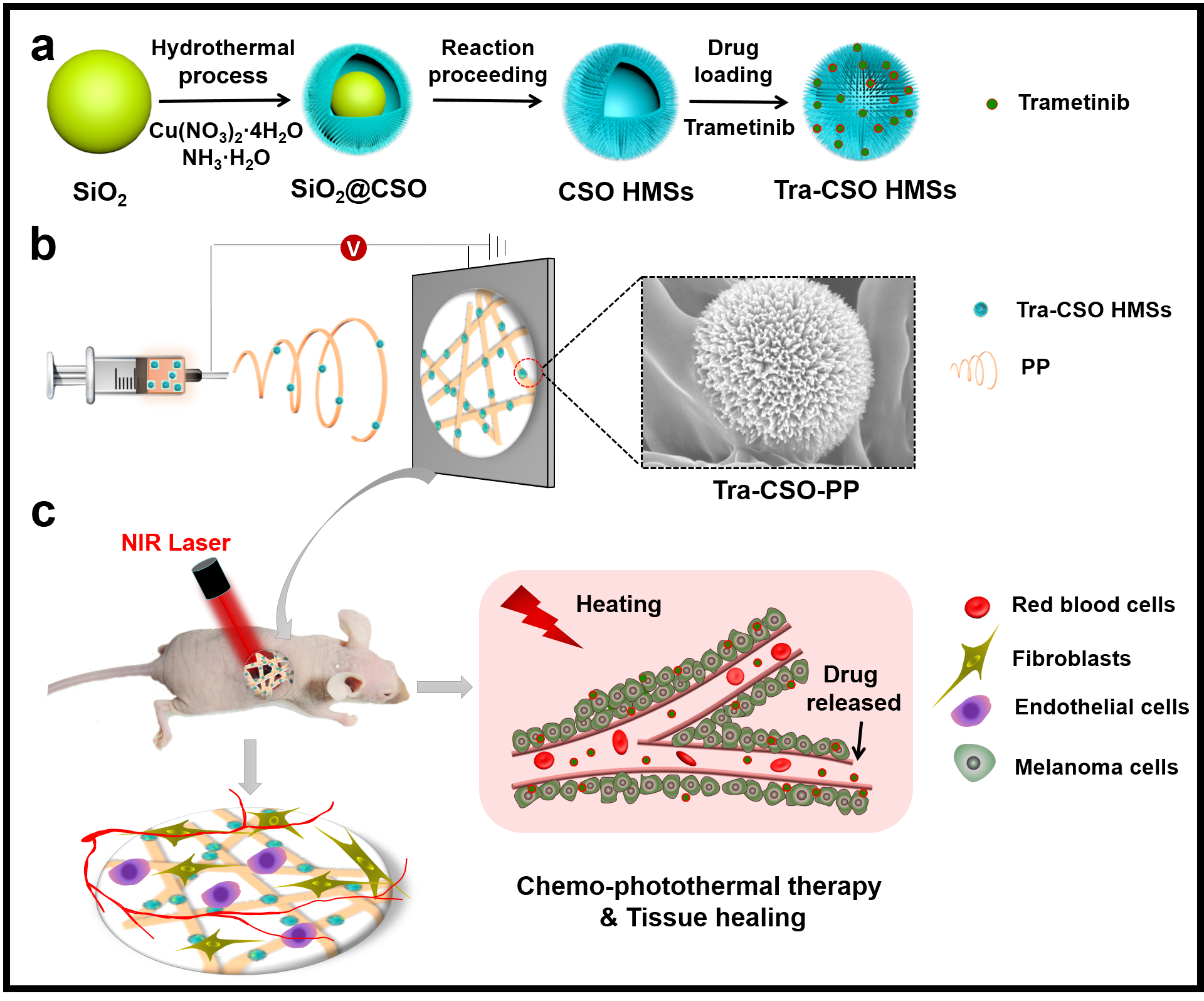 复合支架的制备和应用。(a)以SiO2微球为牺牲模板,采用水热法合成出硅酸铜空心微球,并将化疗药物装载其中;(b)利用静电纺丝技术,将载药硅酸铜空心微球纺入聚合物纤维中,制备出复合支架;(c)复合支架用于黑色素瘤治疗与创伤修复。