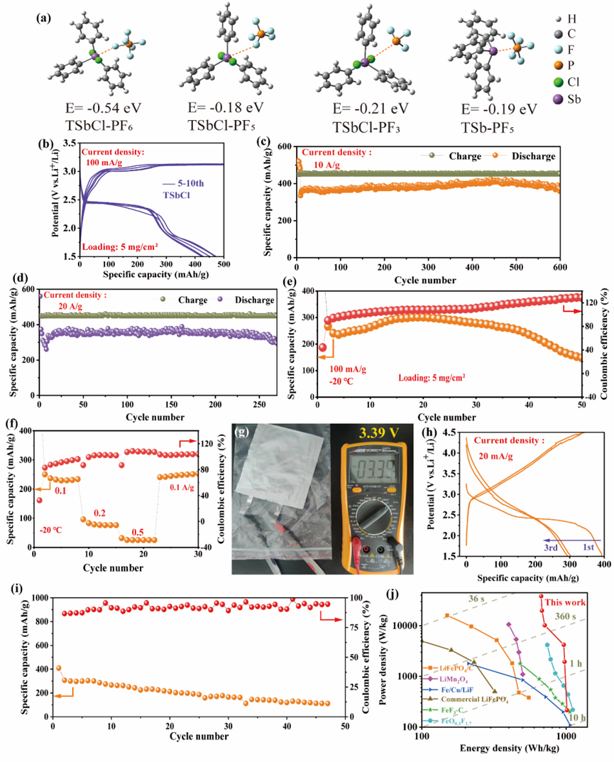 此项工作中,研究团队首次提出了一种高效可充电的Li-CFx二次电池体系。该电池使用氧化处理的氟化石墨(称为CFO)作为正极,并使用氟化铯(CsF)-三苯基二氯化锑(TSbCl)改性的电解液。与苯基相连的五价锑元素可以展现出强的正电性,类似与硼基受体,TSbCl对富电子的氟原子具有显著的亲和力,可以促进CsF的溶解。Cs+离子的持续释放可干预放电过程中Li和F的成键行为,有助于不寻常的双金属氟化物产物CsLiF2的优先形成和生长,由于CsLiF2在充电过程中更容易被电化学劈裂,从而增强了逆转换反应的动力学。TSbCl通过与氟离子和LiPF6盐络合而构建的保护界面能够限制正极侧Li-F基产物的迁移和溶解,这对于提高Li-CFO电池的使用寿命至关重要。正极中的多孔结构是在CFx氧化制备过程中形成的,并伴随着Mn2+-O催化组分的引入,这些因素在降低极化(充电电压可降低至3.2 V)和增强Li-CFO电池的充电能力等方面发挥着重要作用。Li-CFO电池正极不仅实现了高达1012 Wh/kg的能量密度,而且在10和20 A/g的超高电流密度下分别实现了高达19873和38342 W/kg的功率密度。即使在10和20 A/g下运行,电池也表现出超过600和260次的稳定循环,其可逆容量仍然可高达381和364 mAh/g,容量保持率分别为98%和96%。这种Li-CFO电池体系展现出良好的应用前景,它能够在低温下运行(例如,在-20℃下释放超过280 mAh/g的可逆容量),具有低自放电能力(即长的储存寿命),可进行大规模软包电池制造和成功运行,并且可实现高活性材料负载(5-6 mg/cm²)。此项工作使得Li-CFx体系超越了以往仅作为一次电池的角色,有望转变成为兼具低充电电压、高能量/功率密度、高容量保持率以及长循环寿命的快充型二次电池体系。