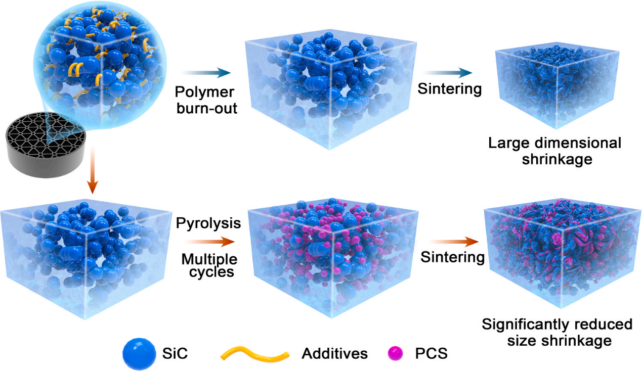 碳化硅(SiC)陶瓷结构件在半导体制造、新能源等高端装备领域的需求日益增长。在半导体制造领域,SiC陶瓷主要用于高端装备工件台、导轨、陶瓷吸盘、手臂等运动部件,其高刚性、低热膨胀系数确保了设备在纳米级运动精度下的稳定运行。在新能源光伏领域,SiC陶瓷取代传统的石英材料,用于扩散炉和LPCVD设备的舟托等载具部件,能使使用寿命提升5倍以上。然而,SiC陶瓷极高的硬度和显著的脆性使其难以通过传统加工方法制造复杂结构件,这一技术瓶颈严重制约了其在高端装备中的应用。3D打印技术成为突破SiC陶瓷制造瓶颈的关键途径。目前,3D打印方法制备的SiC陶瓷主要面向缺陷容忍度较高的反应烧结碳化硅陶瓷,但反应烧结碳化硅陶瓷中存在大量残余游离硅(通常>30vol%),硅熔点低于1410℃,导致其高温性能严重受限,大大限制了3D打印SiC陶瓷极端服役环境下的应用场景。