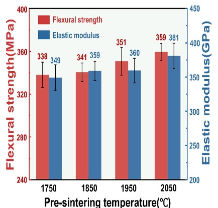 针对上述难题,中国科学院上海硅酸盐研究所黄政仁研究员团队陈健研究员创新性地提出材料挤出(MEX)打印结合前驱体渗透裂解(PIP)与常压固相烧结的复合工艺路线。常压固相烧结路线很好的避免硅相含量过多的问题,可以提高材料在极端环境下使用温度,但3D打印常压烧结SiC陶瓷中有机粘结剂含量高达40-50vol%,烧结形成的孔隙会导致材料收缩率超过20%,尺寸精度严重失控,甚至导致材料开裂。为此,团队提出在3D打印多孔坯体中进行聚碳硅烷(PCS)前驱体的真空浸渍裂解,使其在1300℃下转化为原位纳米SiC颗粒填充孔隙,构建内部微观支撑骨架。此外,为解决坯体强度低的问题,进一步引入预烧结处理工艺(1750-2050℃),在增强坯体强度的同时保持适量开孔结构,实现PCS高效渗透与缺陷控制。该工艺实现了双重突破:一方面在烧结过程中完全避免了游离硅相的生成,使材料具备优异的高温力学性能;另一方面通过PIP过程中形成的SiC骨架有效抑制了烧结收缩,将线性收缩率从21.71%大幅降低至6.38%。最终制备的SiC陶瓷密度达到3.17 g·cm⁻³,抗弯强度为359 MPa,弹性模量为381 GPa,热导率高达165.76 W·m⁻¹·K⁻¹,在1500℃高温环境下仍保持357 MPa的抗弯强度,为极端环境下使用的复杂结构SiC陶瓷部件的精密制造提供了可靠的技术支撑。