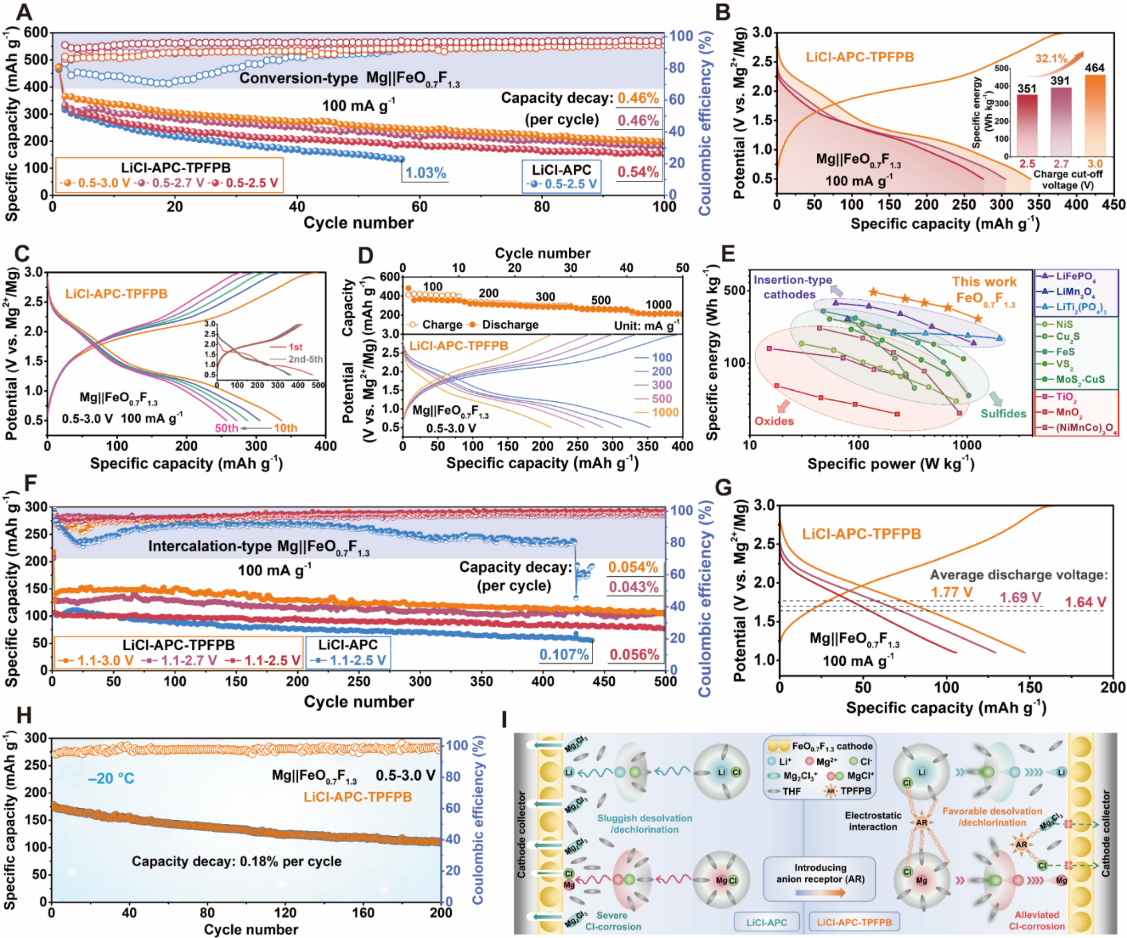 得益于界面电化学行为的改善,由双阳离子共驱动的转换反应型Mg-FeO0.7F1.3电池在宽温域范围内表现出高可逆容量,在25 °C和−20 °C温度下的可逆容量分别为354 和177 mAh g−1。当输出的功率密度为137和 1257 W kg−1时,基于正极活性物质的能量密度分别可达到485和267 Wh kg−1。此外,通过调整充放电电压范围将氟化物正极控制在嵌入反应阶段时,Mg-FeO0.7F1.3电池可以实现超过500 圈的稳定循环,且平均每圈的容量衰减率仅为0.054%。该体系在常规LiCl-APC电解液体系中存在明显的过充行为,库仑效率低且容量衰减迅速。相比之下,使用具有更宽电化学窗口的LiCl-APC-TPFPB电解液,Mg||FeO0.7F1.3电池能够实现高度可逆的充放电反应,库仑效率(CE)可高达约97%,平均容量衰减率仅为0.54%(对比体系为1.03%)。这项工作拓宽了镁金属电池正极材料的选择范围,并为开发高能量密度、高安全性和低成本的储能技术提供了一条有前景的途径。此外,该工作所提出的阴离子受体化学为氯化物基电解液在高压应用中的界面问题提供了一种有效的解决方案。