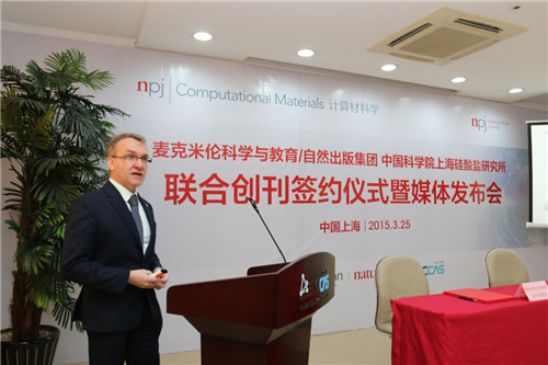 宋力昕致欢迎辞,他表示很荣幸能够和自然出版集团合作创刊。该期刊将自然出版集团的国际影响力、优质稿源吸引力,以及上海硅酸盐所在材料领域的学术积累和工作基础紧密结合起来,推动材料计算科学发展。上海硅酸盐所将与麦克米伦科学与教育/自然出版集团一起,以创新的思想和务实的作风,努力将npj Computational Materials创办成为高起点、高质量、具有全球影响力的计算与材料研究交叉领域的国际核心期刊。