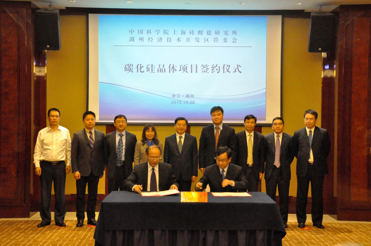 10月28日下午,中国科学院上海硅酸盐研究所与湖州经济技术开发区管理委员会就碳化硅晶体项目正式签署合作协议。浙江省发改委副主任何中伟,湖州市委副书记、市长陈伟俊,湖州经济技术开发区党委书记,管委会主任施根宝,上海硅酸盐所所长宋力昕,所长助理闫继娜,总经济师王喜晴,科技产业处副处长李懋峰,碳化硅项目部刘学超博士和孔海宽博士等参加了签约仪式。