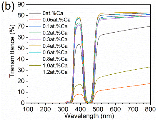 不同Ca2+掺杂浓度Ce,Ca:LuAG闪烁陶瓷的实物照片和透过率曲线