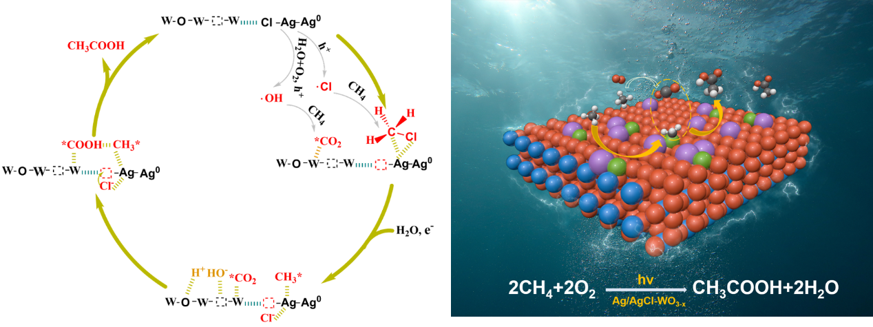 Ag/AgCl-WO3-x光催化甲烷一步产乙酸示意图
