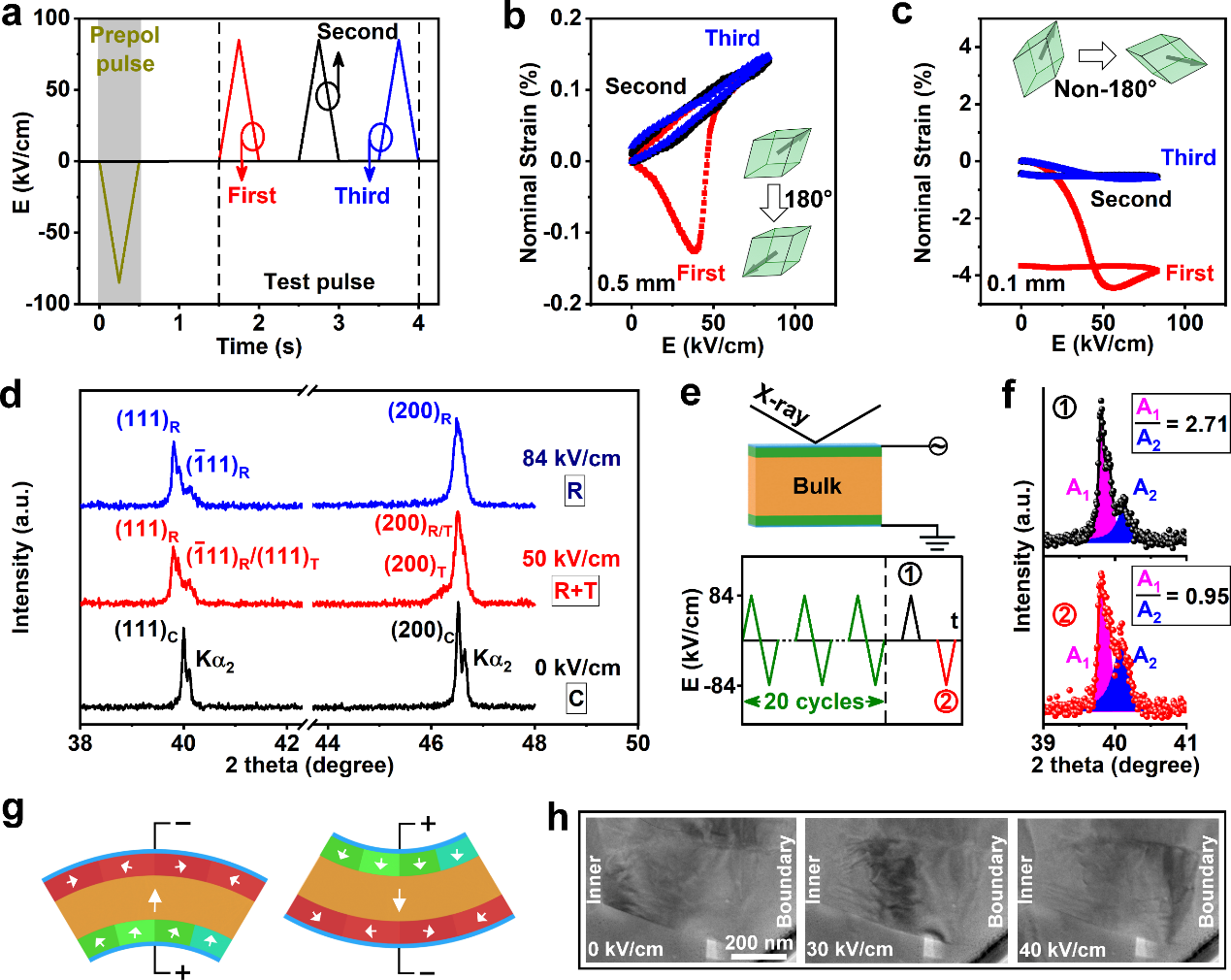 鉴于学界对铁电陶瓷电致应变曲线的解释多建立在样品沿电场方向发生拉伸或压缩形变的假设基础上,该工作所揭示的由上下表面不对称畴翻转诱导的弯曲形变效应不仅为阐明不对称应变曲线的物理起源提供了新的认知,而且为优化铁电陶瓷的机电响应性能提供了新思路。