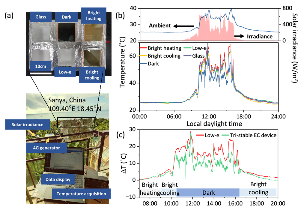 图2. 户外节能性能测试结果。(a)样品及测试方法照片;(b)不同样品的温度测试实时结果及太阳辐照实时结果;(c)实验样品与Low-e样品的实测温差对比。