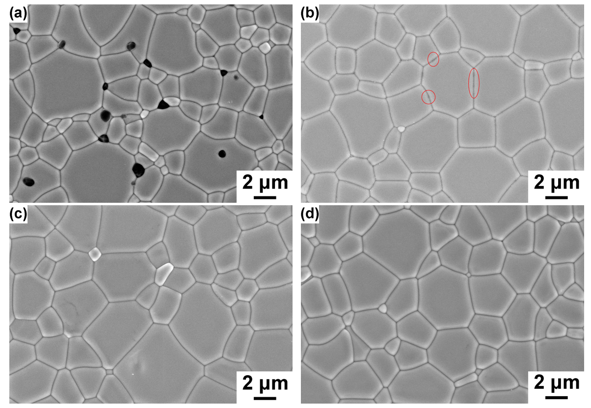 经过真空预烧结合HIP处理后所的TSAG磁光陶瓷的热腐蚀表面FESEM形貌图(a)0wt.%,(b)2wt.%,(c)4wt.%,(d)6wt.% Sc2O3添加量