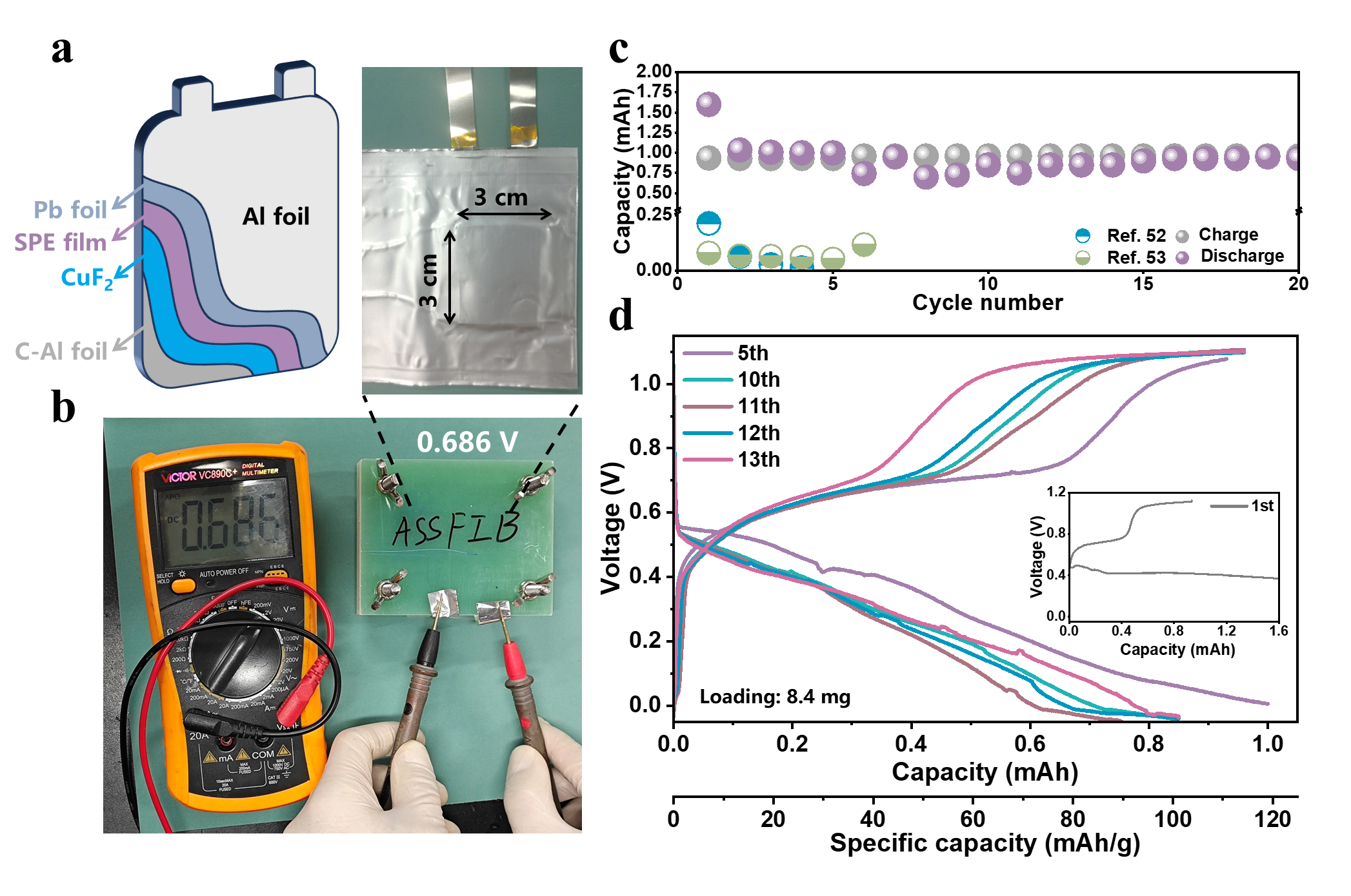 近日,中国科学院上海硅酸盐研究所李驰麟研究员团队提出将聚合物PVA-甘油-CsF体系与锡基F离子固态电解质优势互补,在以PVA为F离子受体基体和以CsF为氟盐的体系中嵌入β-PbSnF4(PSF)来构建三维高速导F网络。PSF钉扎在PVA链段间加快了氟盐的解离速率,并为体系提供额外F源。另一方面,PSF能通过“推-拉”作用弱化羟基H对F离子的过度束缚,营造更温和的氟离子跃迁环境。PSF填料的离子泵效应使得聚合物固态电解质的F离子迁移数达到0.53,离子电导率接近液态电解质水平(60℃为1.04×10-3 S/cm,室温为2.26×10-4 S/cm)。团队首次尝试了聚合物基全固态氟离子软包电池,凭借着有机-无机复合型柔性表面带来的低界面活化能,即使在没有界面润湿剂和额外离子导电网络以及纯金属箔作为负极的条件下,也能实现1mAh和119mAh/g的可逆容量和良好的循环稳定性。聚合物基电解质的使用避免了陶瓷基固体电解质的高脆性,在柔性FIBs领域显示出光明的前景。