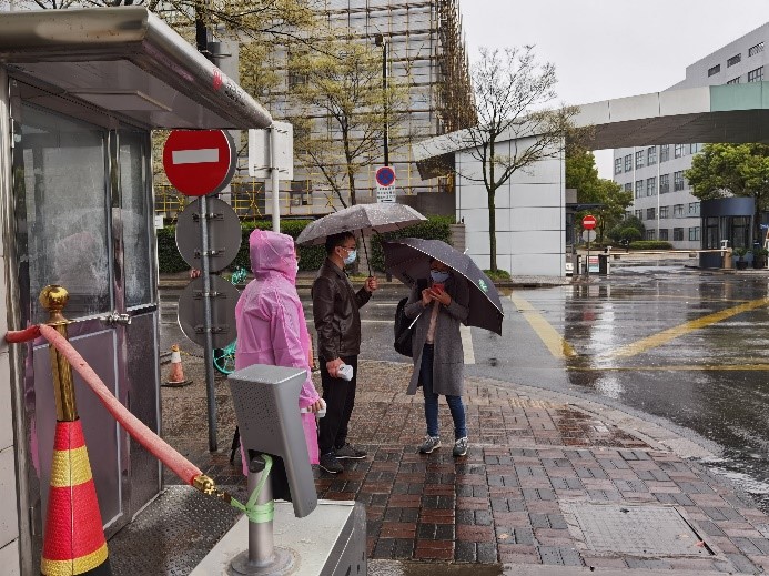 志愿者在园区门口开展“两码”查验和体温检测工作