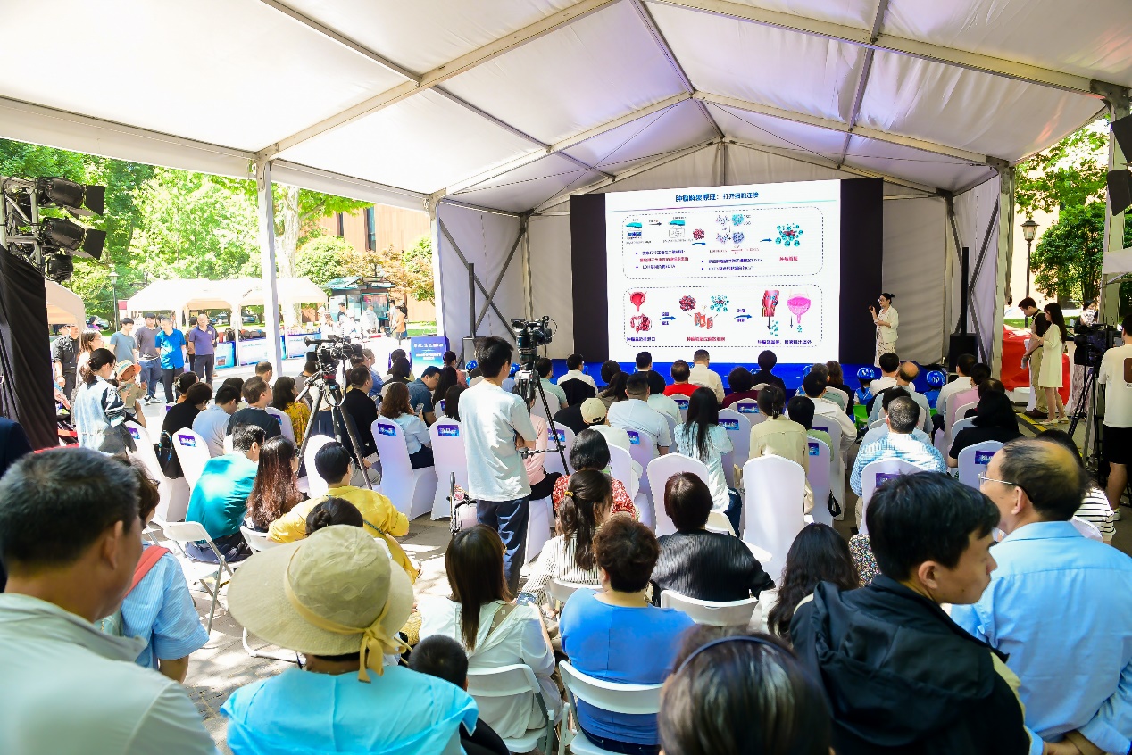 胡萍受邀在“创新说”板块作了题为“腔道肿瘤解聚治疗新技术”的科普报告,从临床高发的靠近排泄口的腔道恶性肿瘤讲起,引出肿瘤解聚的概念和原理:材料螯合钙黏蛋白的钙离子,切断细胞间连接,肿瘤解聚为离散细胞从而排出体外。她介绍了相关研究进展并作了展望。