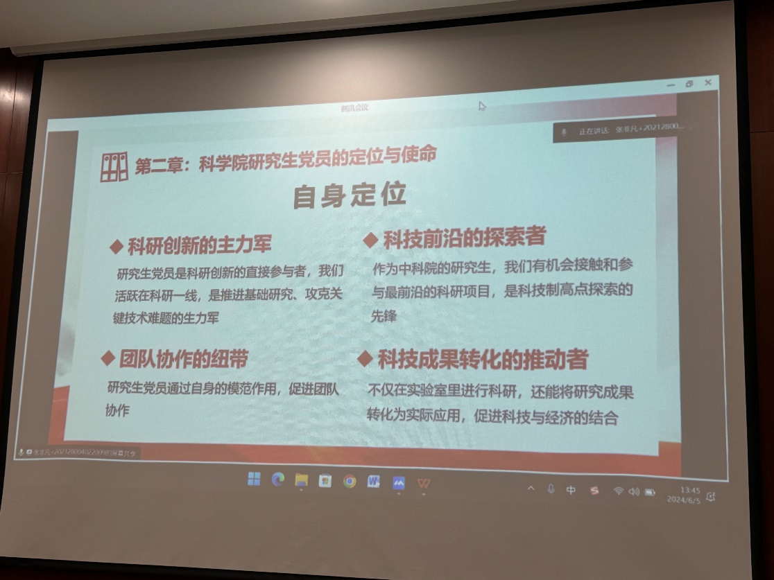 第一项议程,讲一次党课。为加强理论学习,筑牢思想根基,本次活动围绕“加快抢占科技制高点步伐——我是党员·我履职·我发挥作用”主题,邀请张非凡和刘文晴两位毕业生党员进行相关专题党课的分享。张非凡以“加快抢占科技制高点-研究所党员的使命与担当”为题,分享了科学院针对抢占科技制高点的改革措施以及研究生党员的定位和使命。不忘初心,牢记使命,努力在科研攻关、学术创新以及社会服务上做出贡献。刘文晴认为抢占科技制高点是加快实现高水平科技自立自强的必然选择,青年工作者应该抢抓新赛道新机遇,助力抢占科技制高点。在实际工作中敢于挑战、锐意进取,为实现科技强国梦贡献青春力量。抓住改革的机遇,进一步增强使命感和责任感,以更加饱满的热情和务实的作风投身科技创新事业。