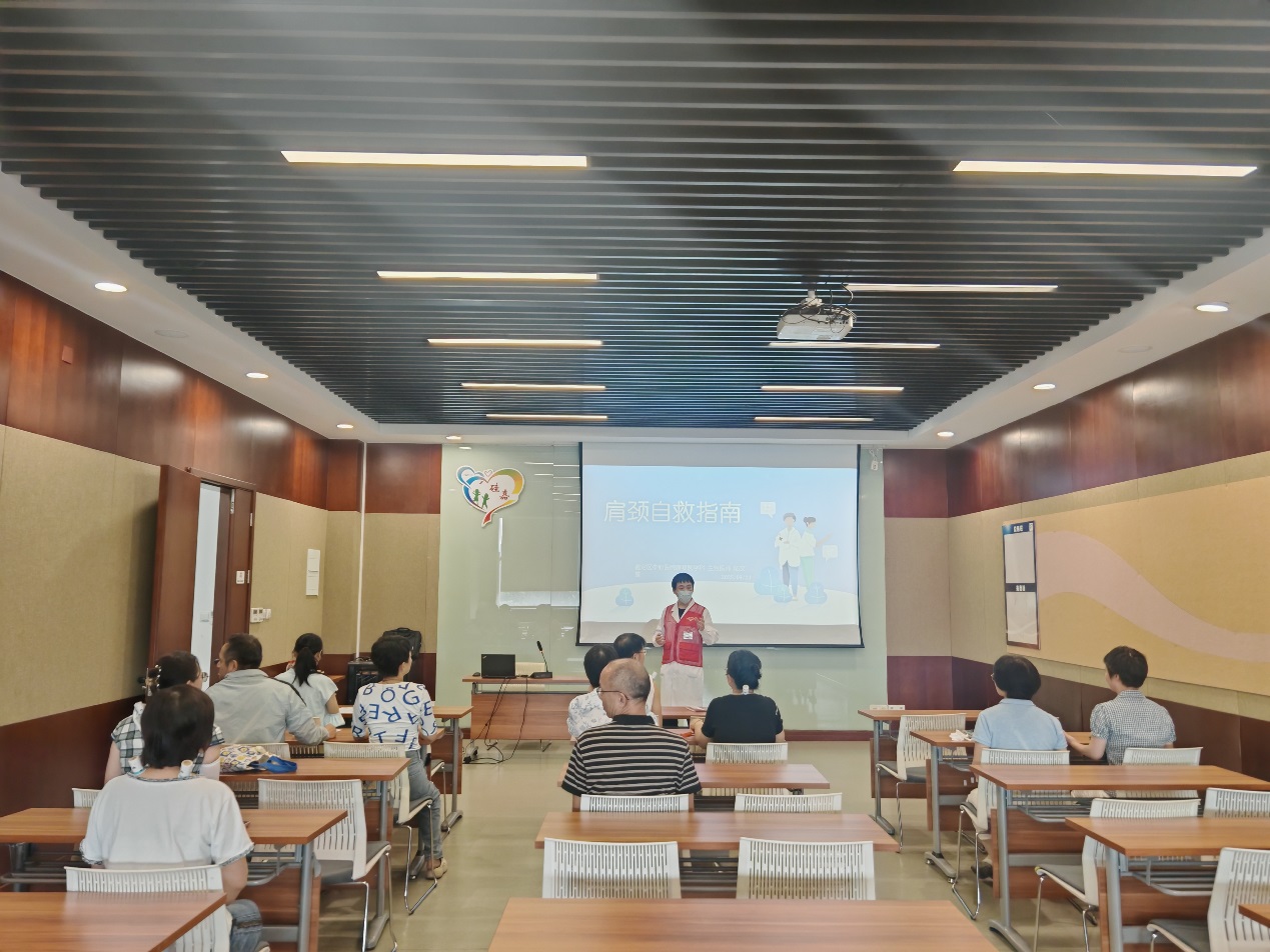 活动共有三个环节。健康讲座由嘉定区中心医院医生陆文誉讲解肩颈康复,并现场带领大家进行肩颈操练习,帮助职工掌握科学肩颈保健技巧,缓解办公疲劳。健康咨询由嘉定区中心医院的康复医师、骨科医师现场坐诊,针对颈椎病、肩周炎、腰腿痛、骨关节疾病等办公人群常见健康问题,提供专业咨询与个性化指导。互动体验由菊园新区社区卫生服务中心提供中医透药、雷火灸、耳穴压豆三种中医项目,现场体验中医特色疗法。