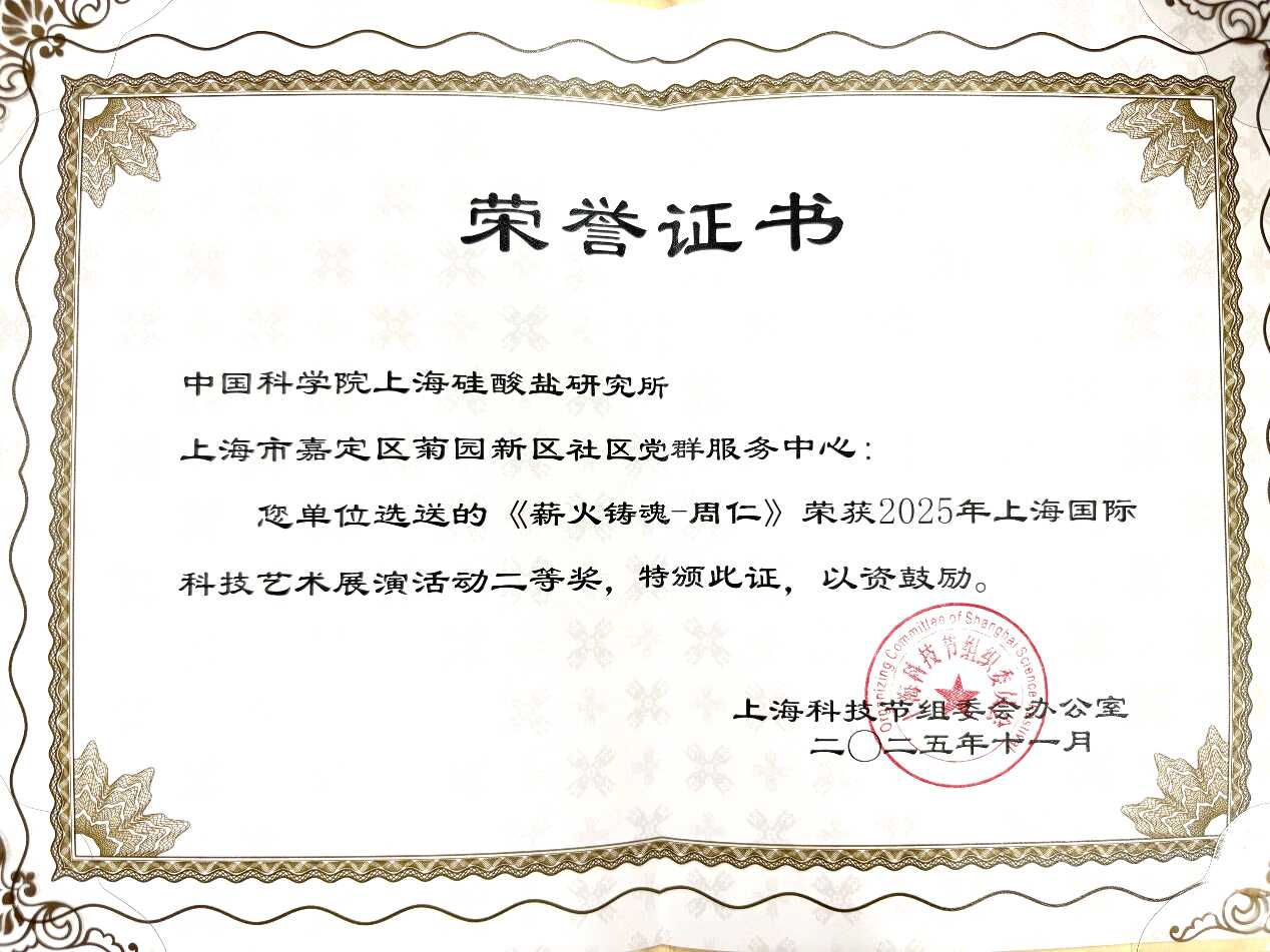 近日,2025年上海国际科技艺术展演总决赛结果揭晓,中国科学院上海硅酸盐研究所与上海市嘉定区菊园新区社区党群服务中心联合创作的《薪火铸魂——周仁》舞台剧荣获二等奖。据悉,此次大赛共设一等奖6项,二等奖8项,三等奖10项。在11月14日于上海电视台上视大厦举办的总决赛上,上海硅酸盐所所办公室仲鹤代表舞台剧主创团队参加了现场答辩,向评委团作创作阐释。
