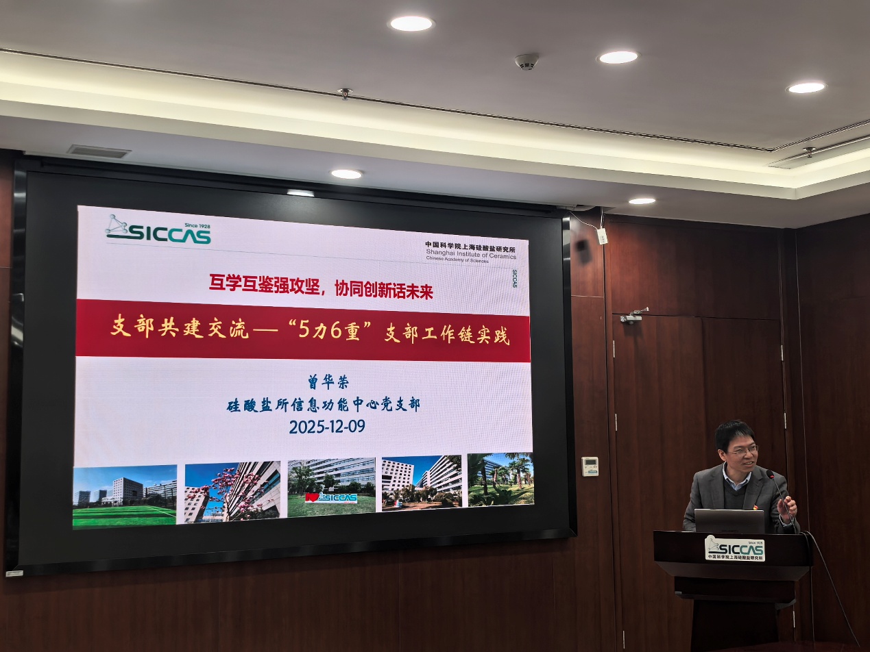 为深入学习贯彻党的二十届四中全会精神,12月9日下午,中国科学院上海硅酸盐研究所信息功能材料与器件研究中心党支部与中国科学院宁波材料技术与工程研究所原子尺度微纳制造实验室党支部联合开展“互学互鉴强攻坚,协同创新话未来”主题党日活动。上海硅酸盐所党委委员、所务委员、党委办公室主任、所办公室主任毛朝梁,宁波材料所原子尺度微纳制造实验室党支部书记曹彦伟,上海硅酸盐所纪委委员、信息功能中心主任王根水,信息功能中心党支部书记、副主任曾华荣及双方党员和科研人员等参加了共建活动。活动由信息功能中心党支部副书记梁瑞虹主持。