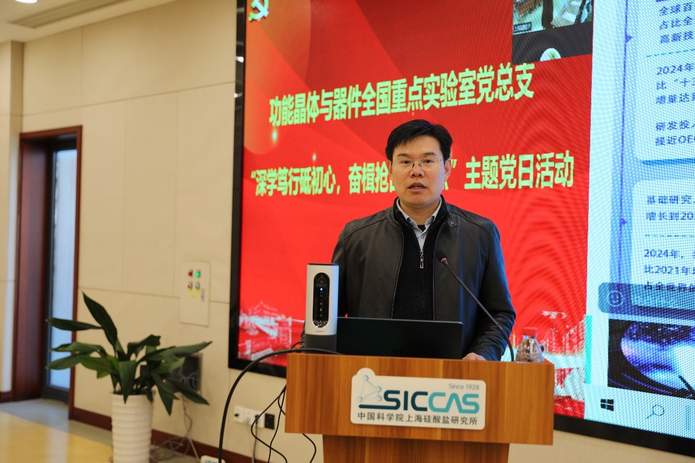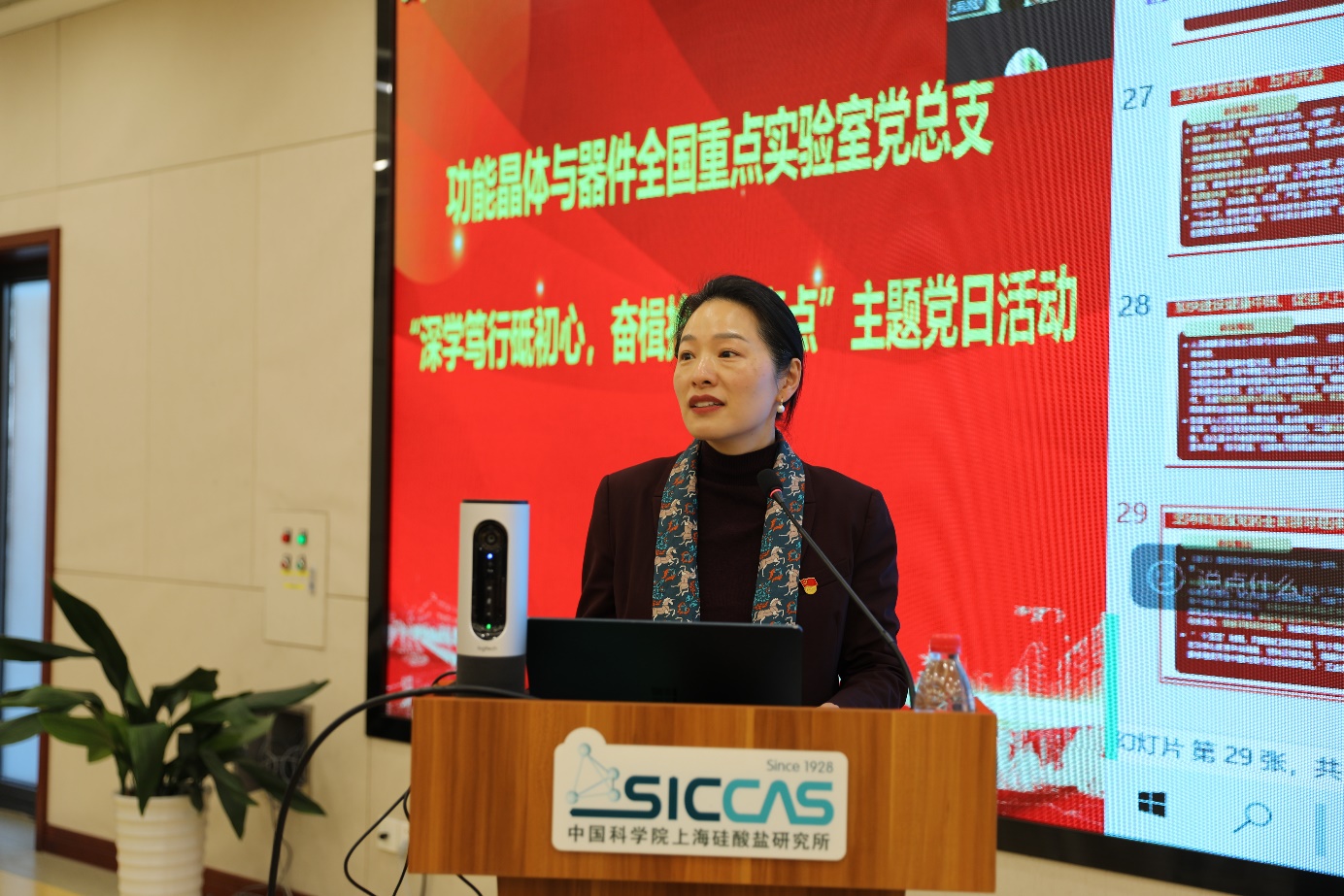 为全面推进实验室高质量建设,11月20日下午,功能晶体与器件全国重点实验室上海硅酸盐所党总支(以下简称“晶体全重党总支”)组织开展“深学笃行砥初心,奋楫抢占制高点”主题党日活动暨全体职工大会。上海硅酸盐所党委书记王东,所长苏良碧,所党委委员、所务委员、党委办公室主任、所办公室主任毛朝梁,所务委员、晶体全重党总支书记、人工晶体研究中心副主任吴云涛,所党委委员、人工晶体研究中心党支部书记、主任刘学超,党委办公室副主任陆贝妮,人工晶体研究中心副主任孔海宽、副主任姜大朋,新材料中试研发中心主任丁栋舟,晶体全重党总支副书记、新材料中试研发中心党支部书记袁兰英,新材料中试研发中心党支部副书记、副主任朱勇,新材料中试研发中心副主任贾颖楠及党总支的60余名党员及科研人员参加。活动由袁兰英主持。