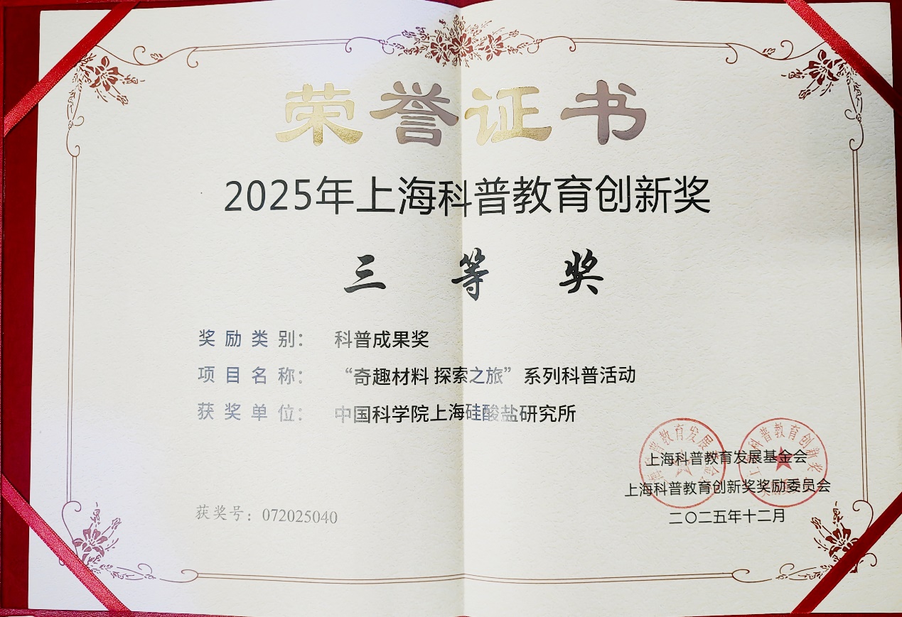 12月20日,由上海科普教育发展基金会、上海科普教育创新奖奖励委员会发起的2025年度上海科普教育创新奖颁奖典礼在上海儿童艺术剧场举行,表彰为上海市科普事业作出突出贡献的个人和组织。中国科学院上海硅酸盐研究所“奇趣材料 探索之旅”系列科普活动荣获2025年上海科普教育创新奖科普成果奖(三等奖)。上海硅酸盐所所办公室仲鹤代表科普团队参加典礼并领奖。