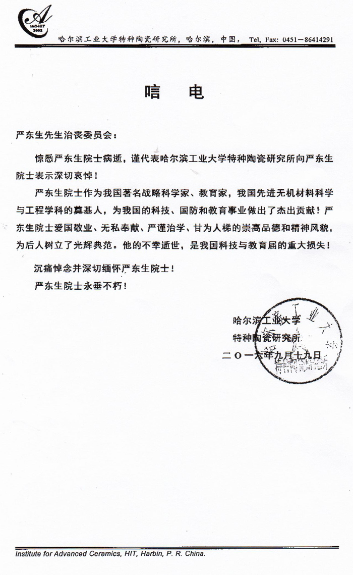 哈尔滨工业大学特种陶瓷研究所致唁电