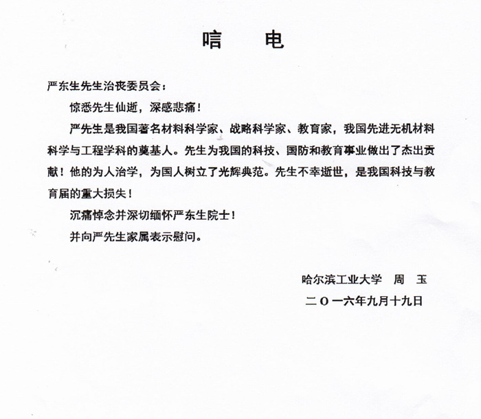 周玉院士对严东生院士的逝世表示哀悼,对其家属表示慰问