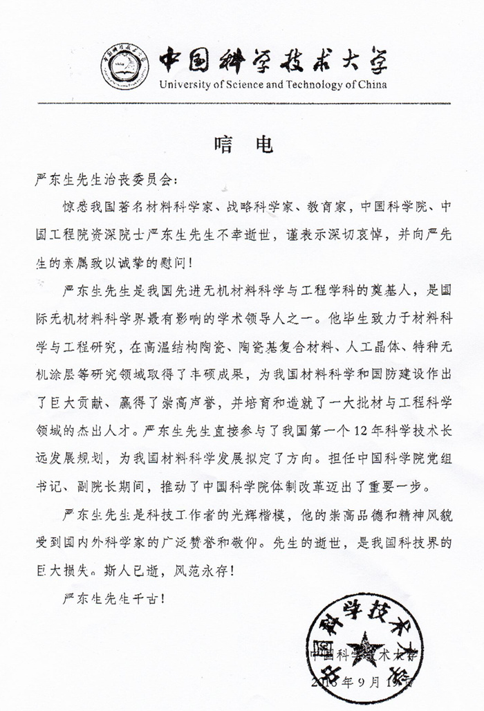 中国科学技术大学致唁电