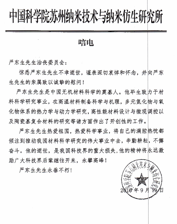 中国科学院苏州纳米技术与纳米仿生研究所致唁电
